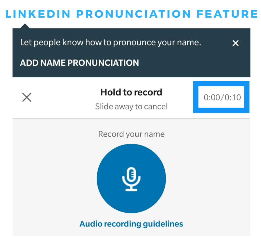 Well, LinkedIn has come to his & its users rescue. They’ve released the Pronunciation Feature in the name badge, where the user can record a 10 second audio for the same.